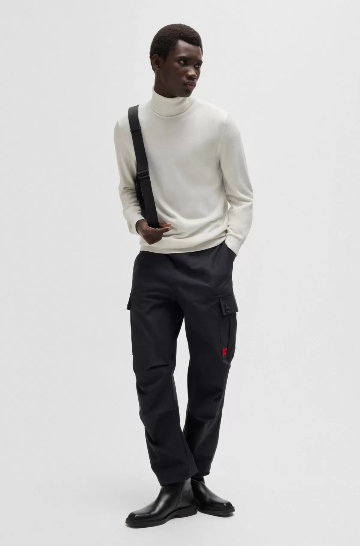 En rullekravesweater fra HUGO herretøj. Denne maskuline sweater er skåret i regular fit i ny uld for god temperaturregulering og har et broderet HUGO-logo for diskret branding.Vi bruger altid mindst 60 % bæredygtige råmaterialer i vores RESPONSIBLE-produkter. Dette produkt er fremstillet med ansvarligt produceret og certificeret uld. For os betyder ansvarligt produceret uld, at det er fri for mulesing og lever op til de fem friheder for dyrevelfærd.