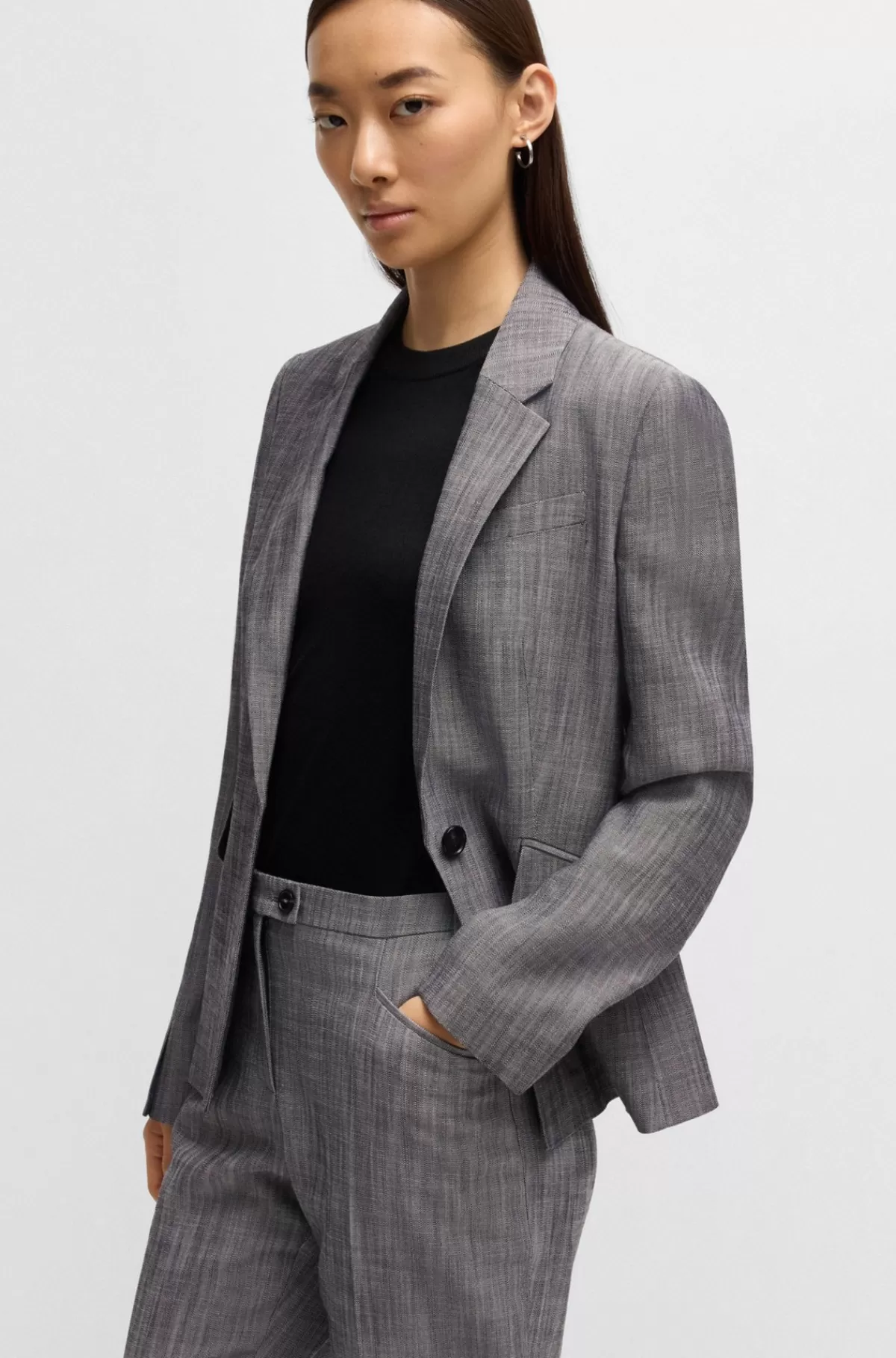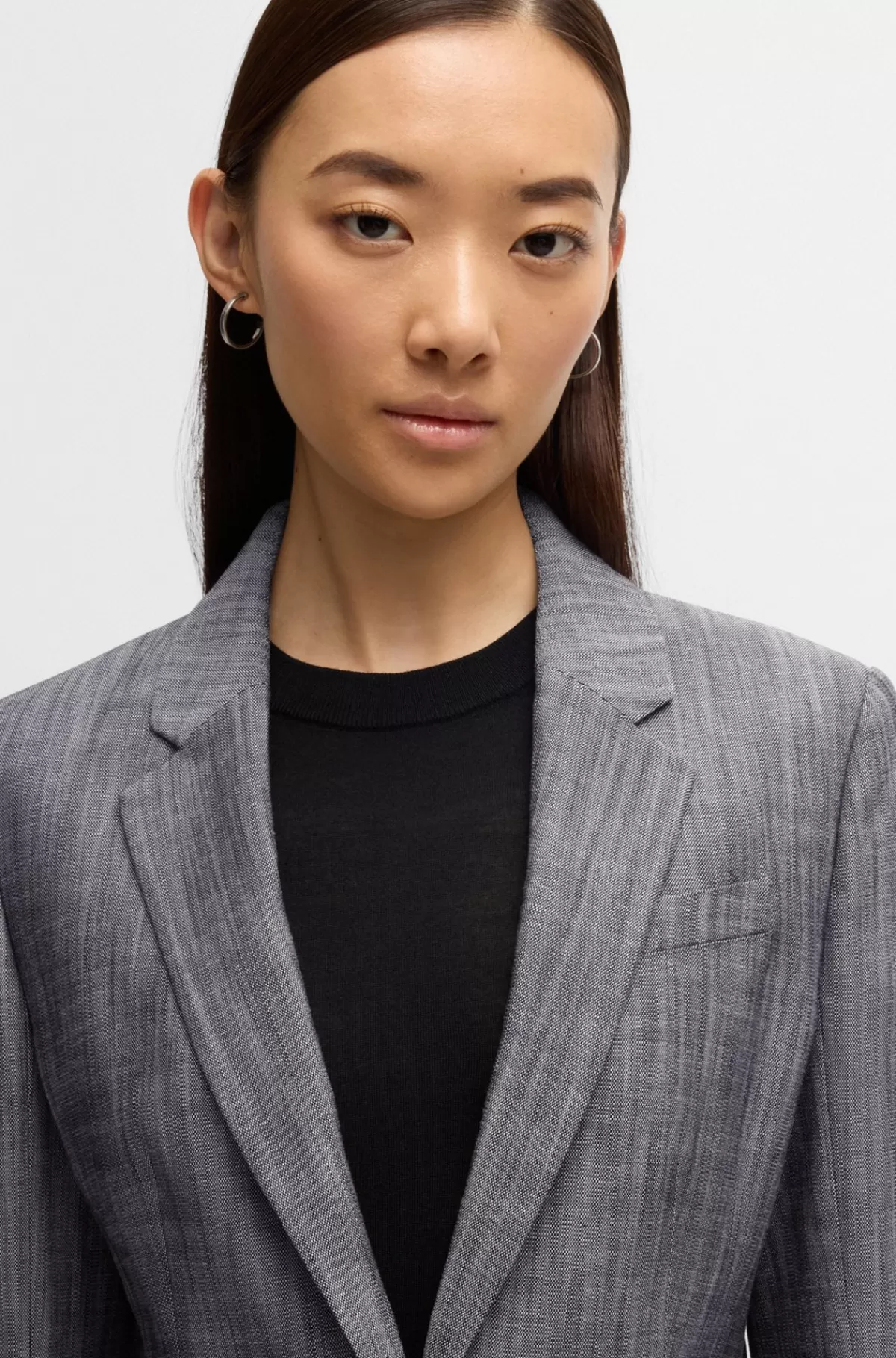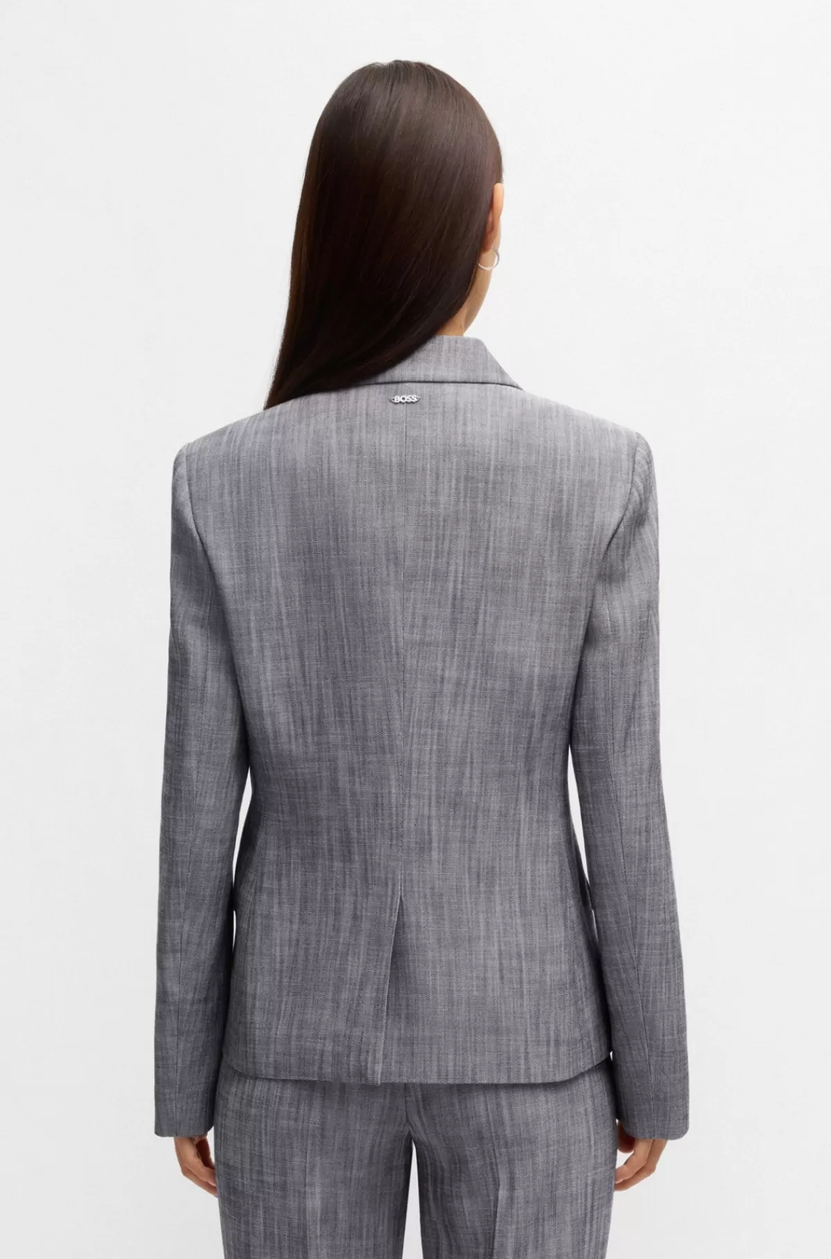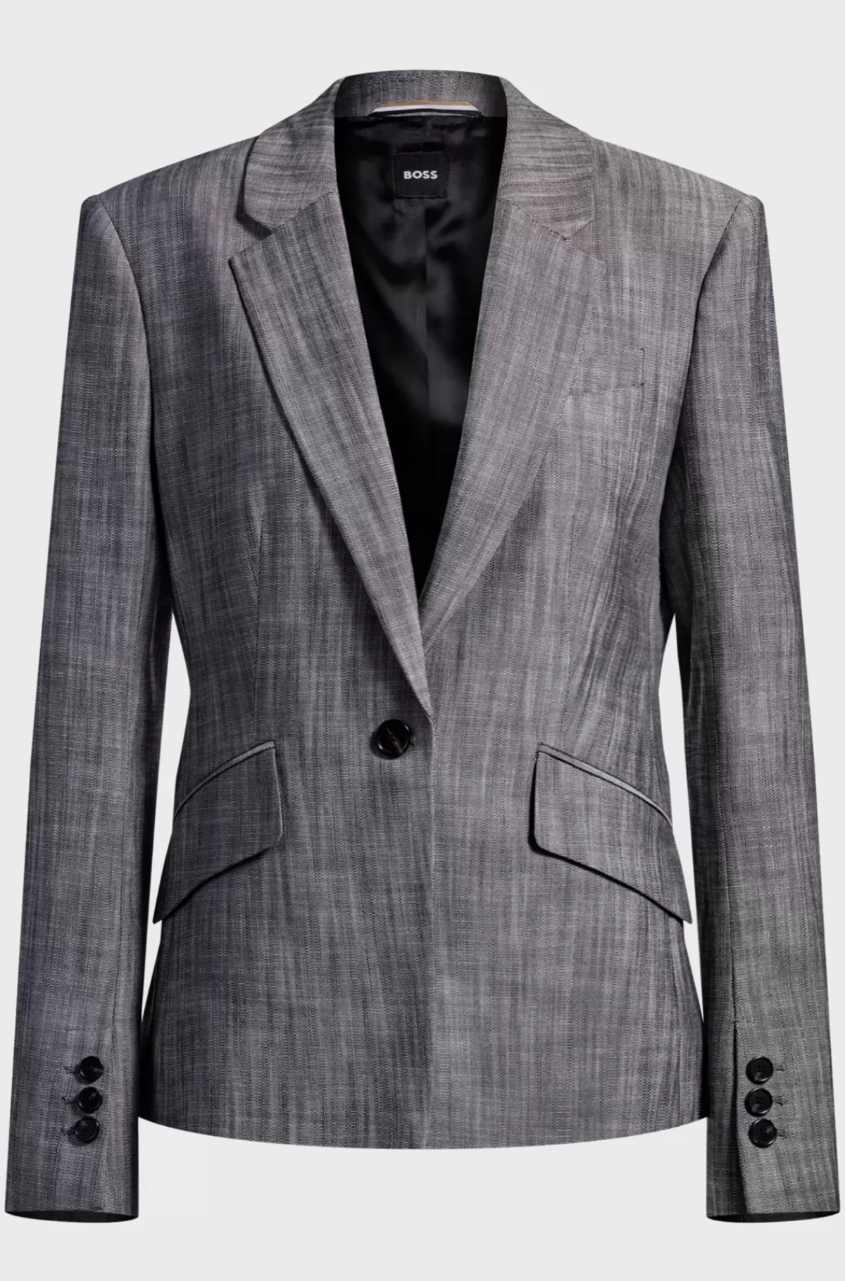 En blazer med enkelt knaplukning og diagonale lommer fra BOSS Womenswear. Denne smarte jakke med flatterende slim fit er lavet i meleret sharkskinstof. Dette produkt er lavet af cellulosefibre udvundet af naturlige råmaterialer af træ fra ansvarligt forvaltede skove. Vi samarbejder med eksterne organisationer for at sikre en respektfuld behandling af nye og truede skove.