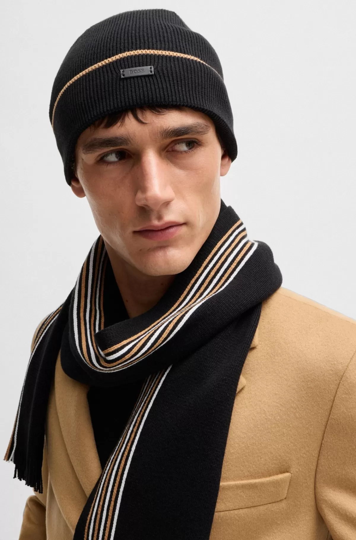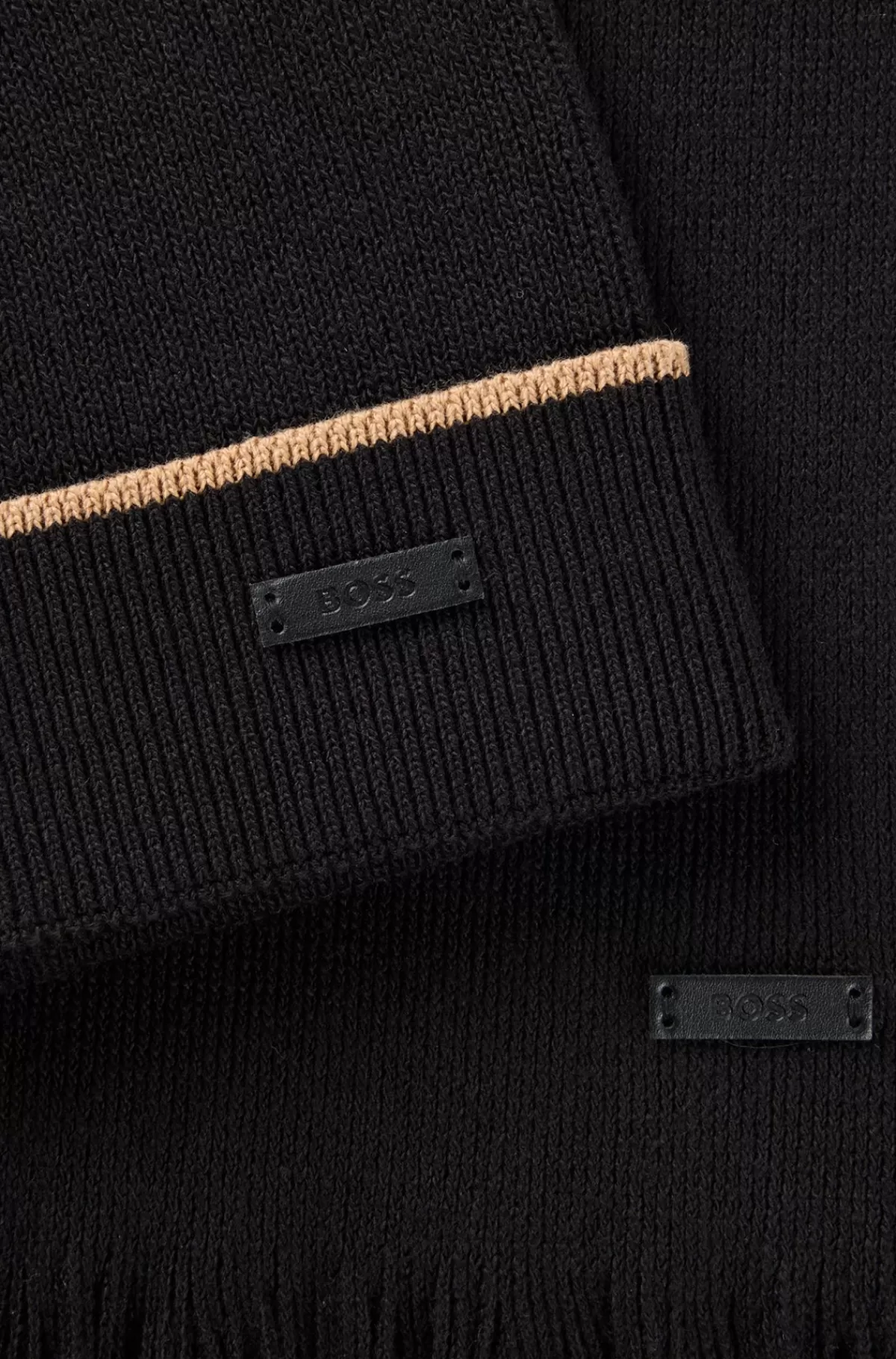 Brandet hue med matchende rashelstrikket tørklæde fra BOSS. Denne accessory i en blanding med bomuld leveres i en gave…