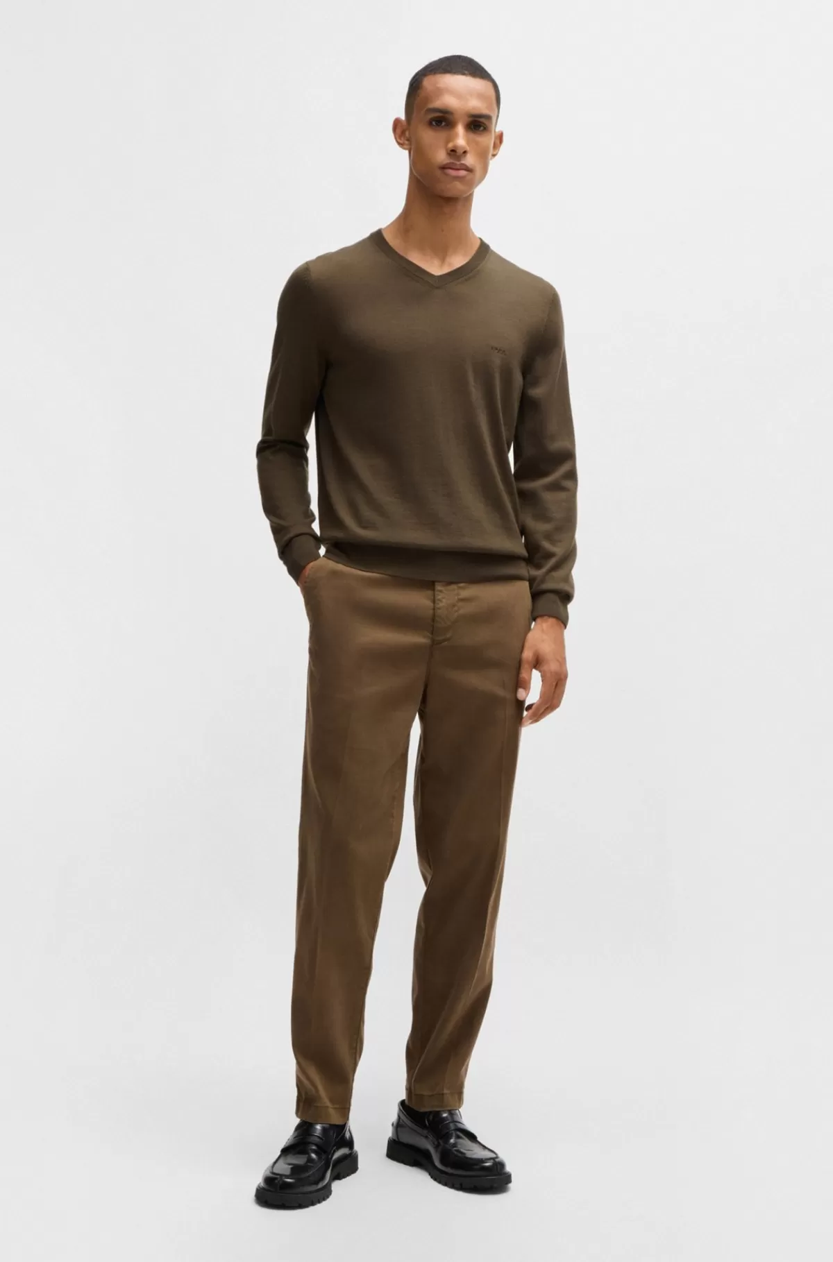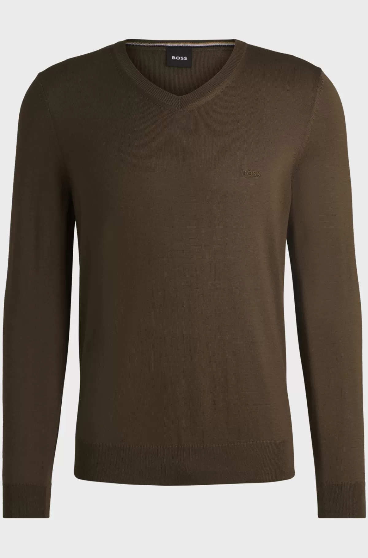 Sweater med V-hals og regular fit fra BOSS. Denne sweater er strikket i blødt og åndbart garn og har et broderet BOSS-logo. Dette produkt er fremstillet af ansvarligt produceret uld. For os betyder ansvarligt produceret uld, at det er fri for mulesing og lever op til de fem friheder for dyrevelfærd.
