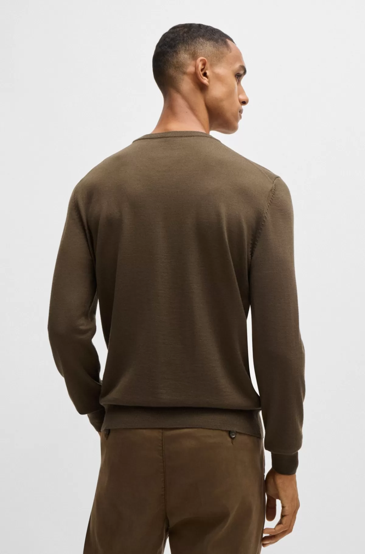 HUGO BOSS Regular Fit Sweater I Ny Uld Med Broderet Logo Mørkebrun Best Sale