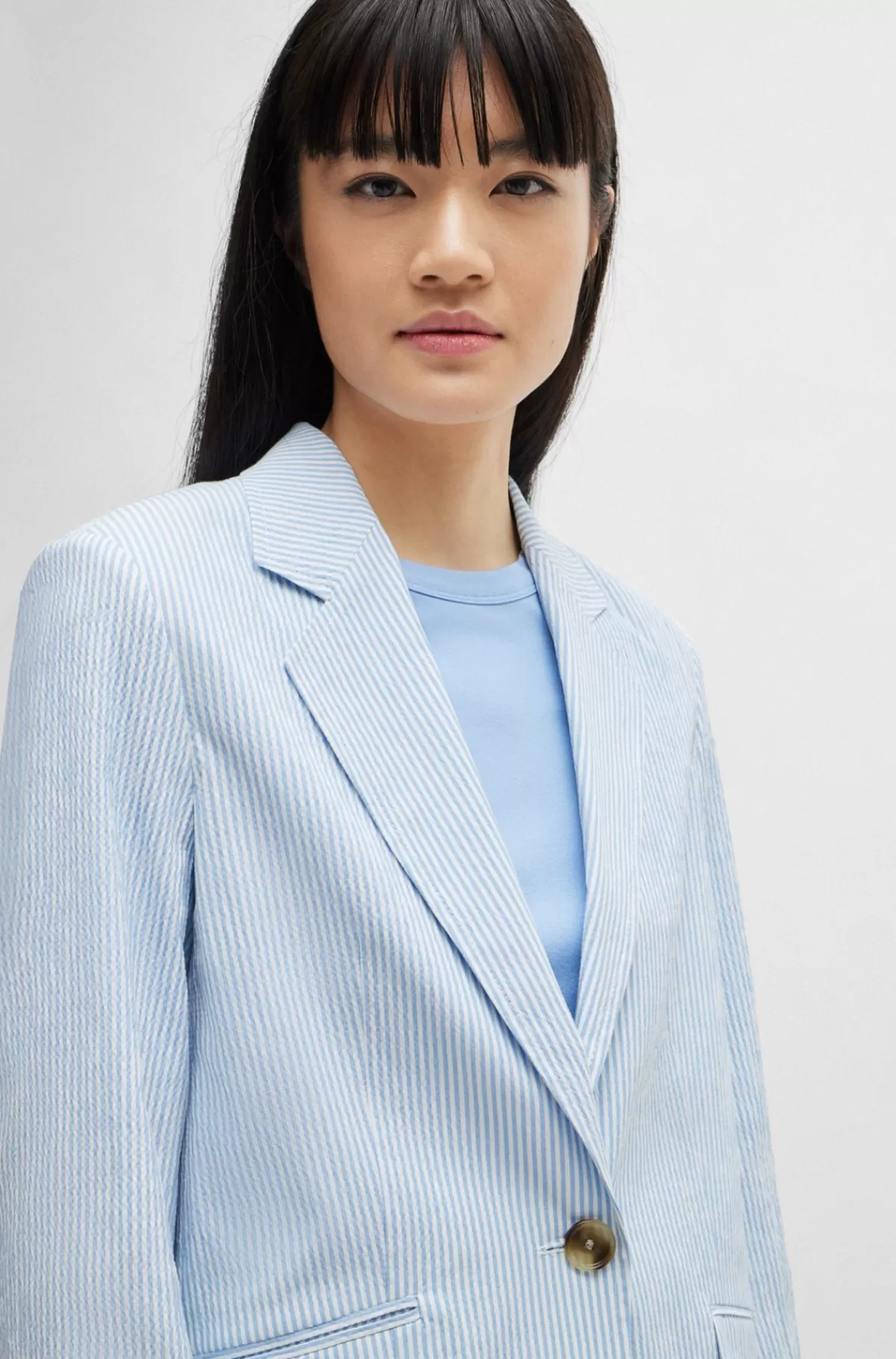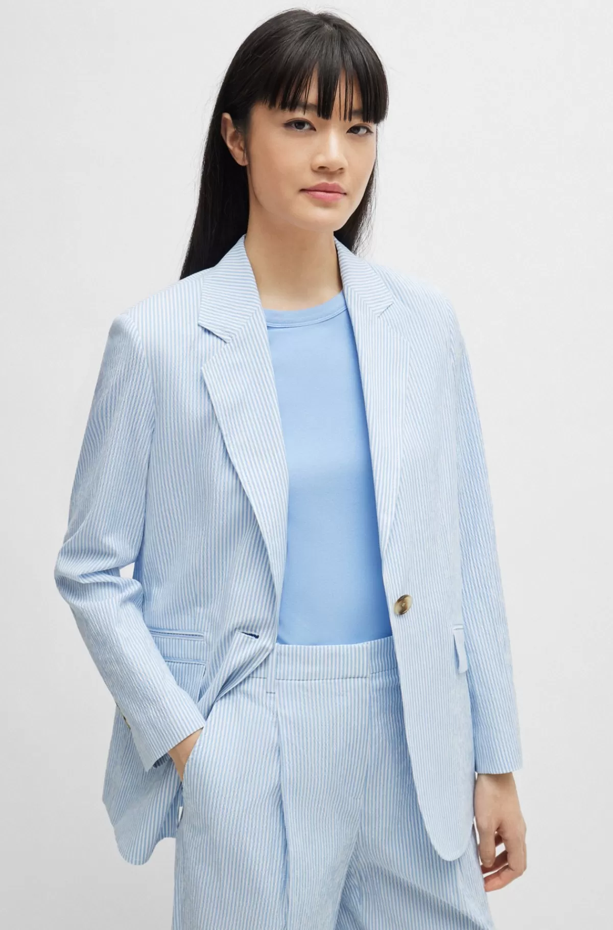 Relaxed fit jakke med en enkelt knap fra BOSS Womensweari bomuld-seersucker med stræk mønstret med lodrette striber.