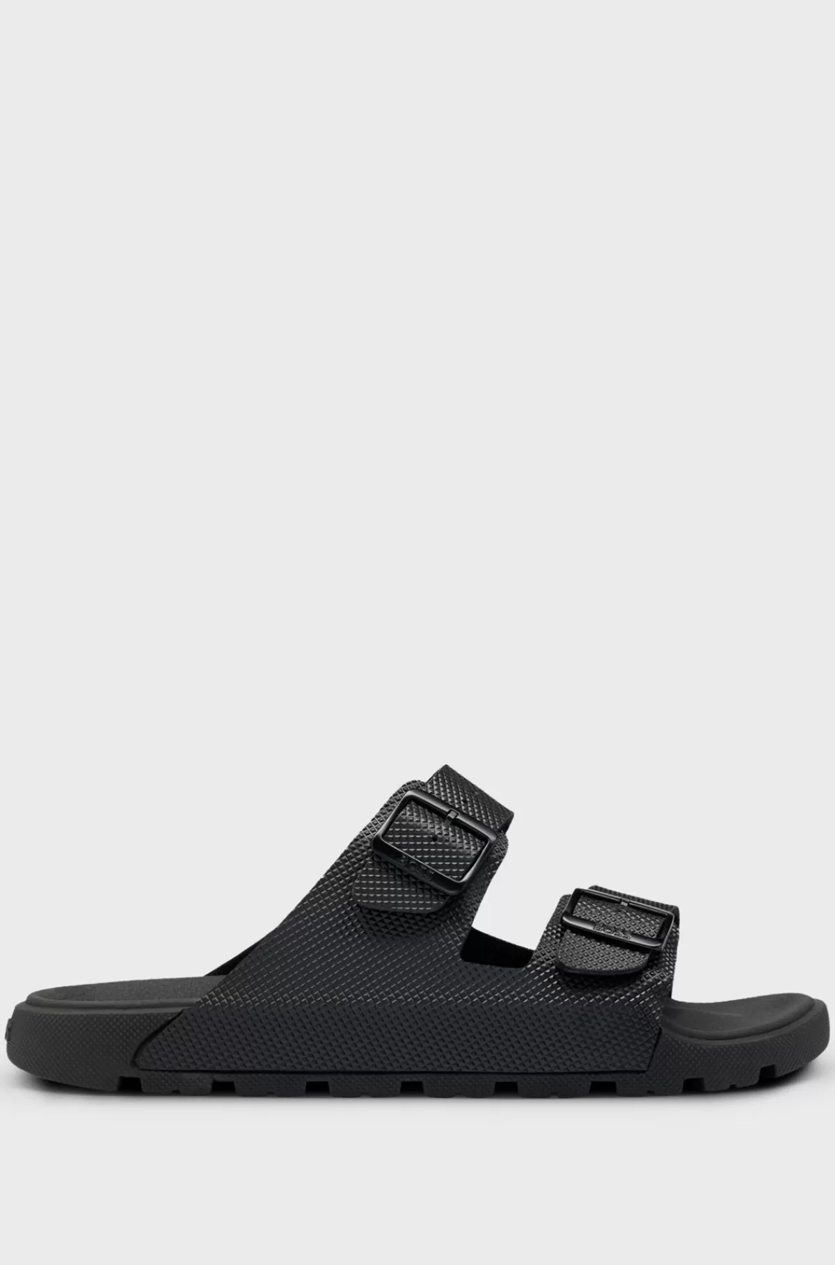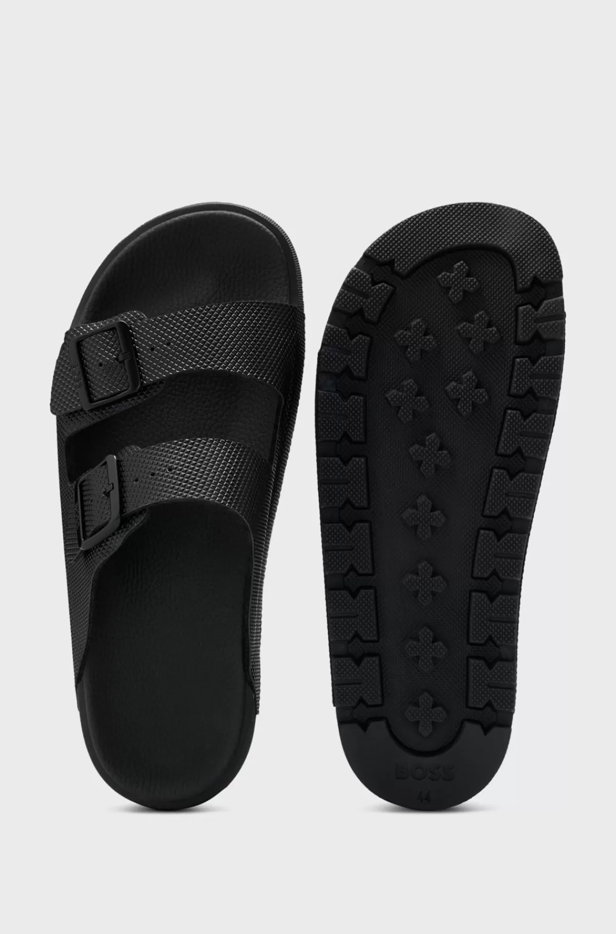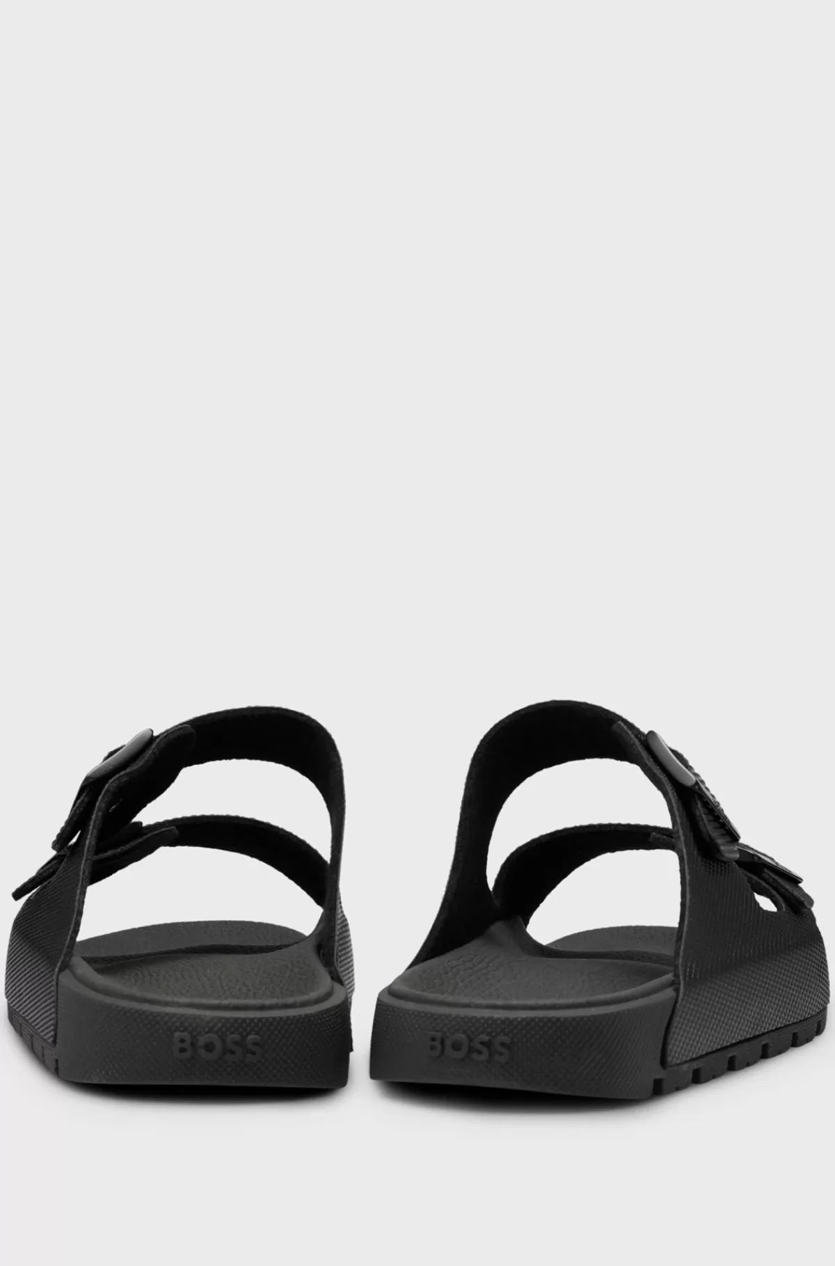 Moderne sandaler til alle køn i struktureret gummibehandlet materiale med dobbeltrem og brandede spænder fra BOSS.