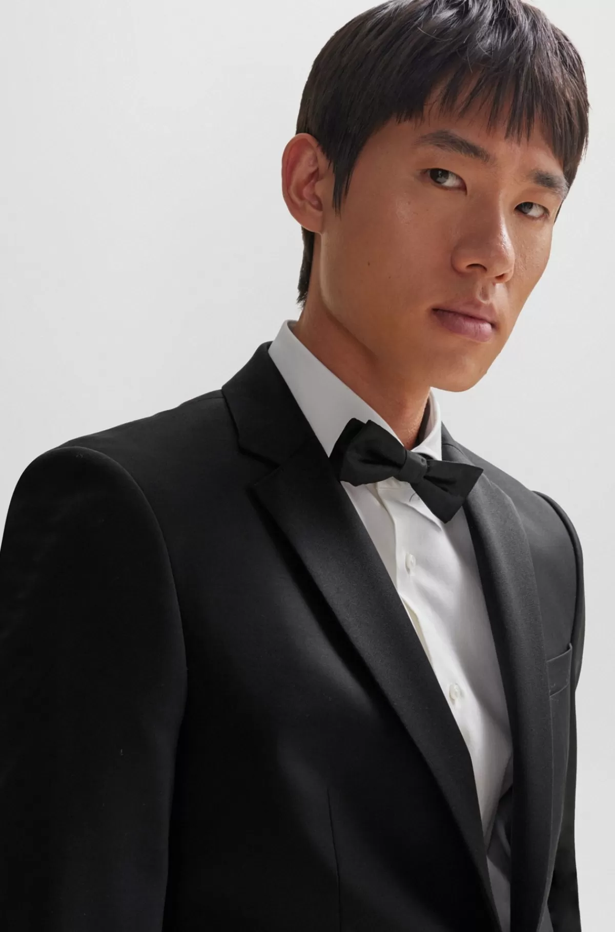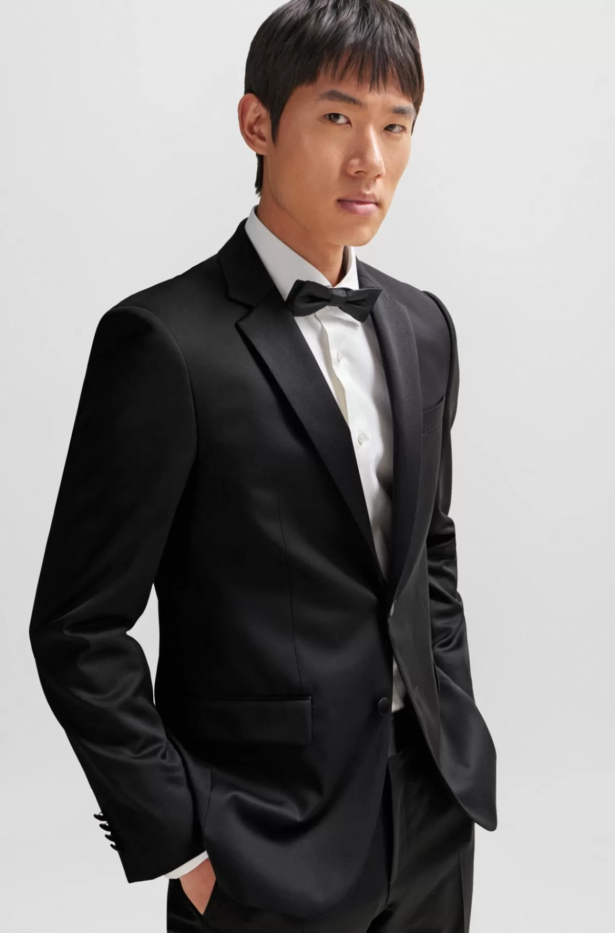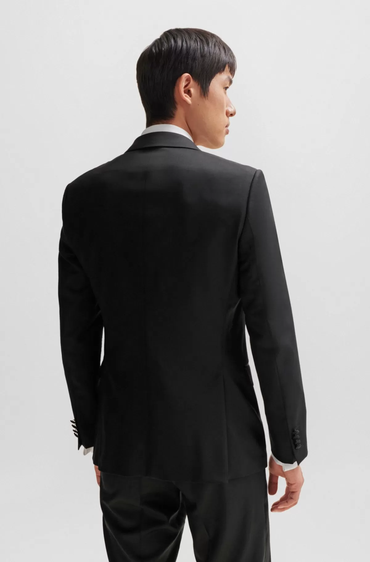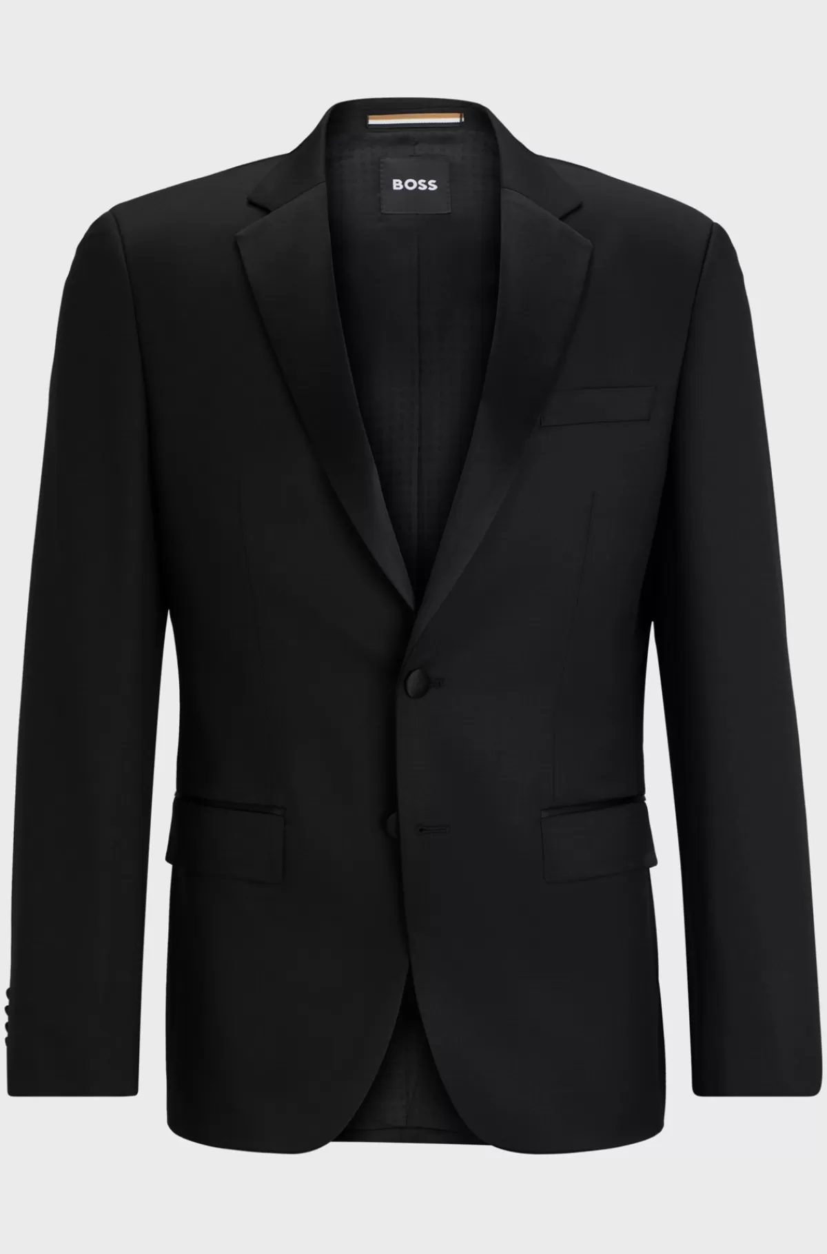 Moderne smokingjakke med silkeblandede kanter fra BOSS. Denne elegante jakke har sergevævning og en slank silhuet.