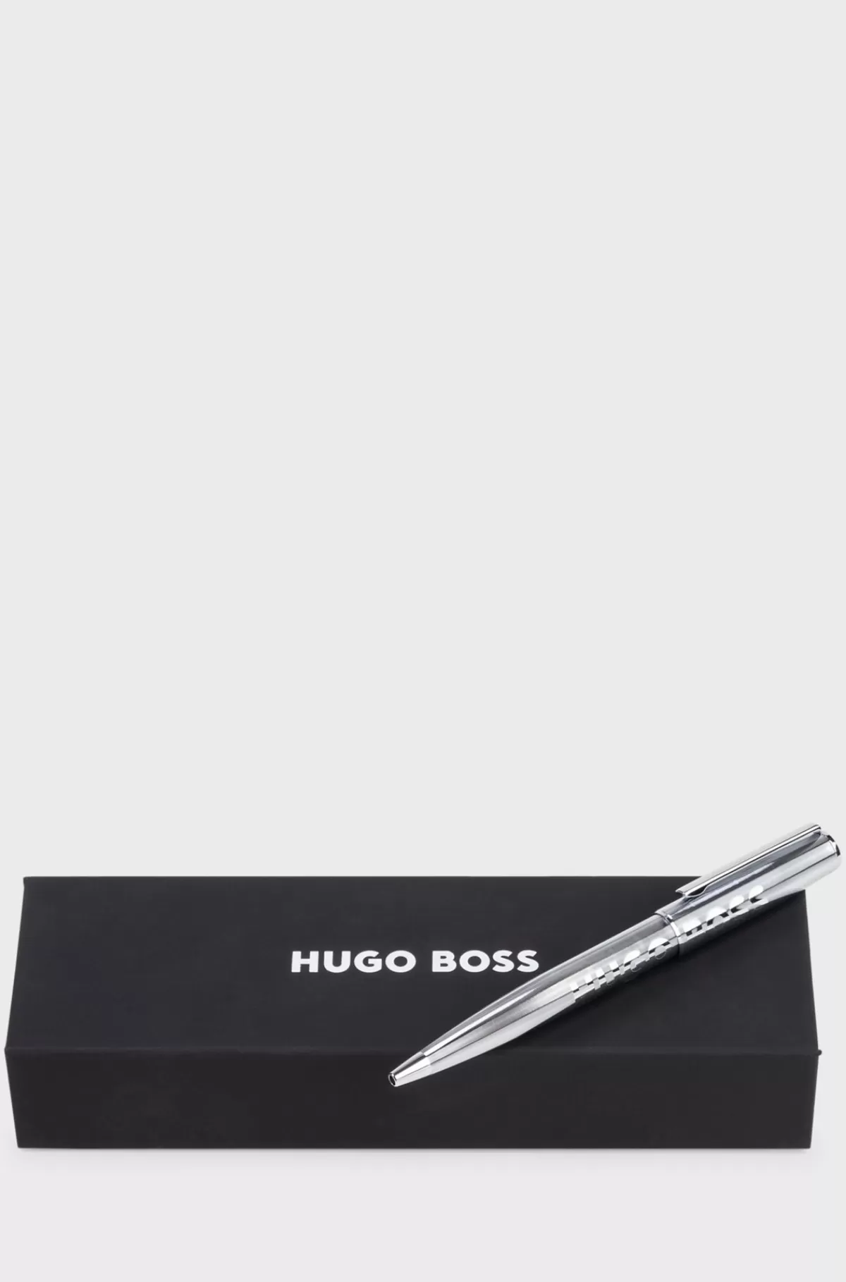 En moderne kuglepen med kuglespids fra BOSS. Denne kuglepen i gaveæske er lavet af messing med en overfladebehandling i krom og ensfarvede detaljer, samt et BOSS-logo hen over blækbeholderen i en frisk og elegant stil. Toppen har yderligere BOSS-mærker.