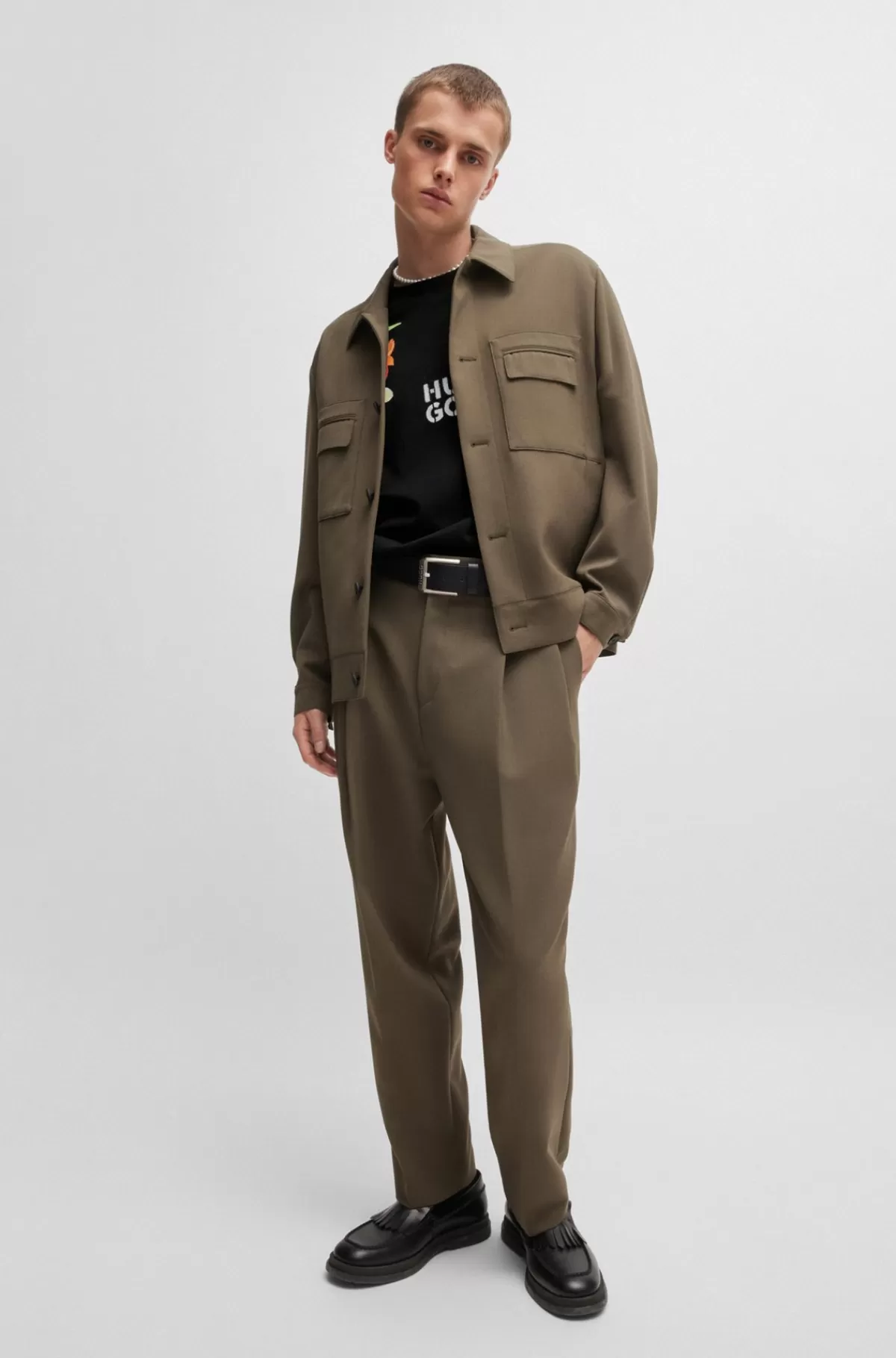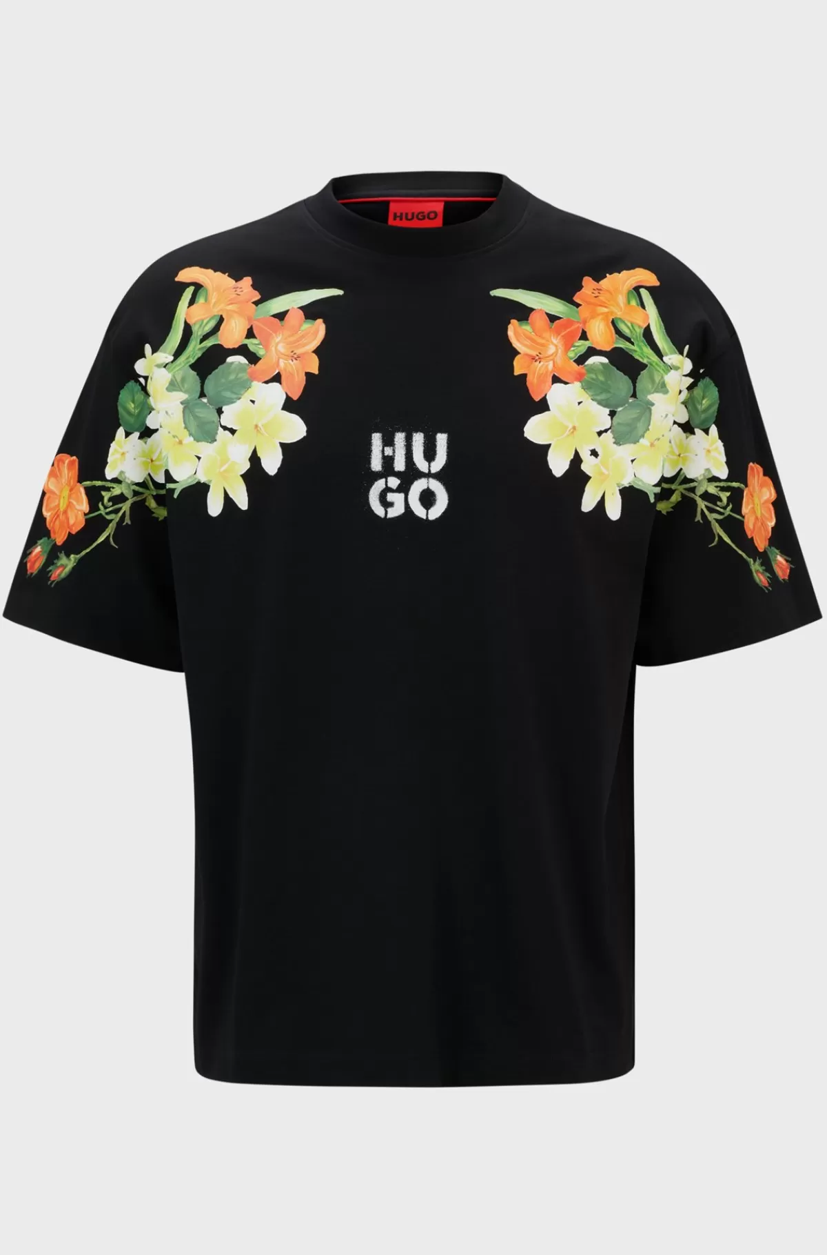 En moderne T-shirt med blomsterprint på brystkasse og ærmer fra HUGO Menswear. T-shirten med oversize fit og stablet logo er lavet af tung bomuldsjersey.