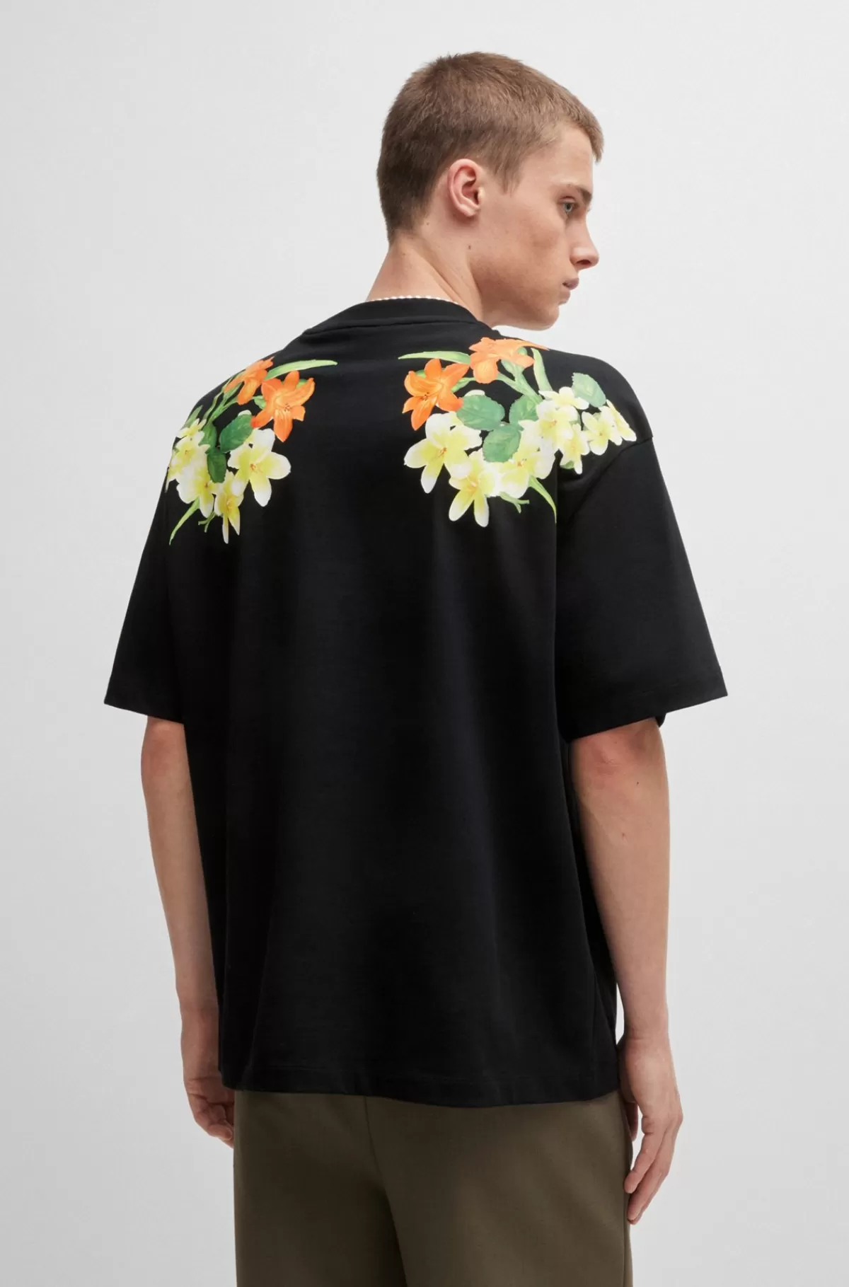 En moderne T-shirt med blomsterprint på brystkasse og ærmer fra HUGO Menswear. T-shirten med oversize fit og stablet l…