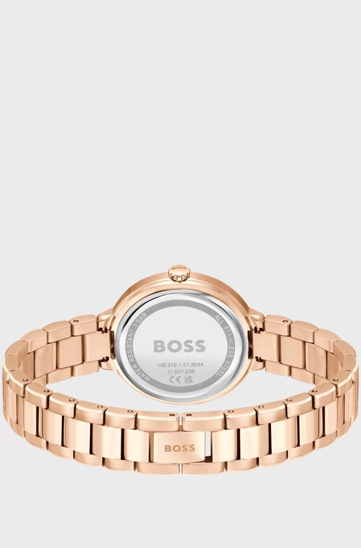 Et moderne ur i gyldent stål og lænkerem fra BOSS. Armbåndsuret har en sort urskive med monogram og krystalmarkører.