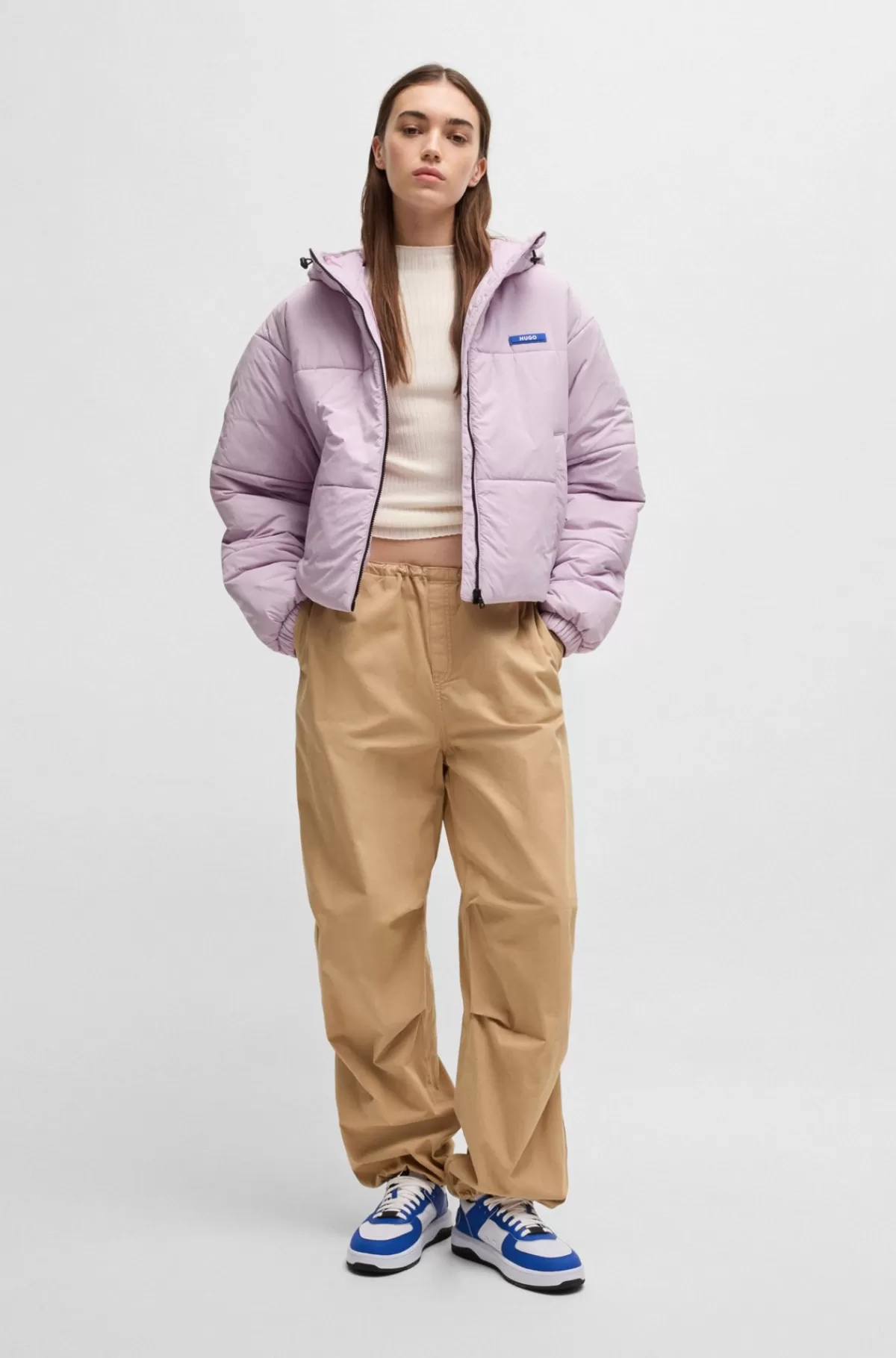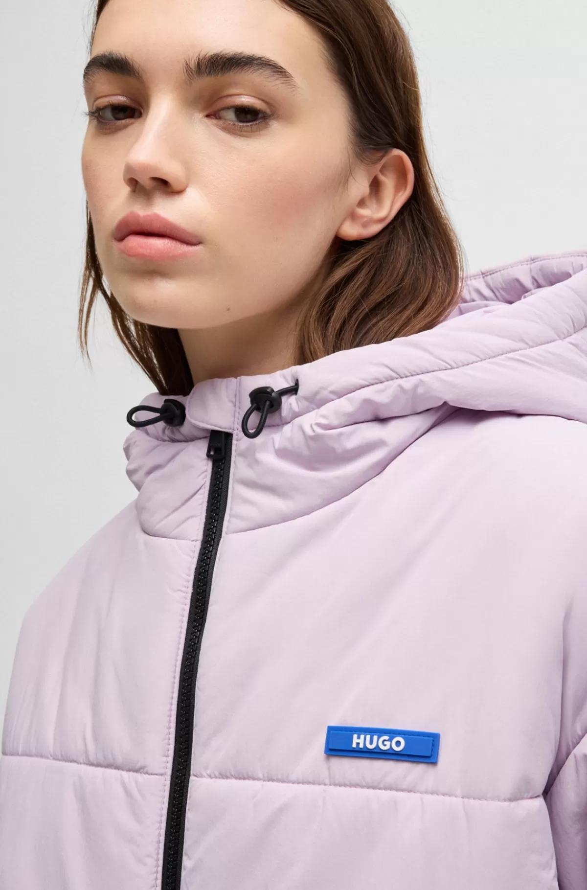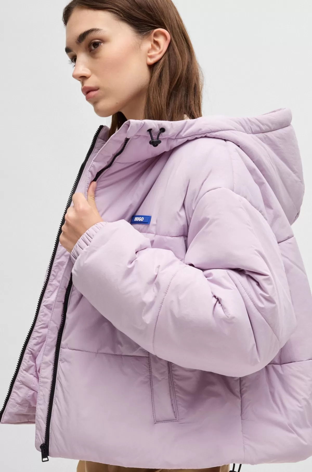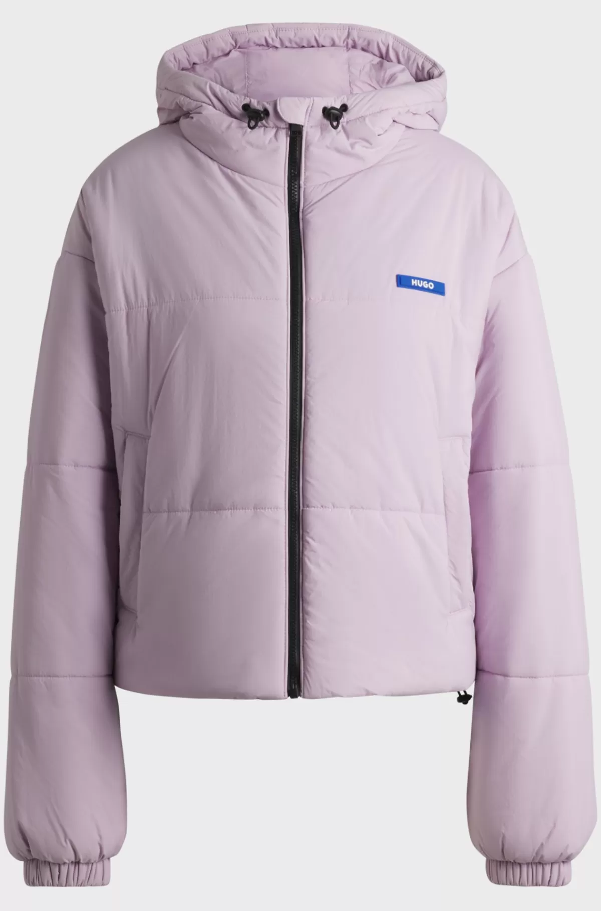 Jakke med justerbar hætte og let fyld fra HUGO. Den har et moderne design og relaxed fit med vandskyende finish og et blåt logomærkat.